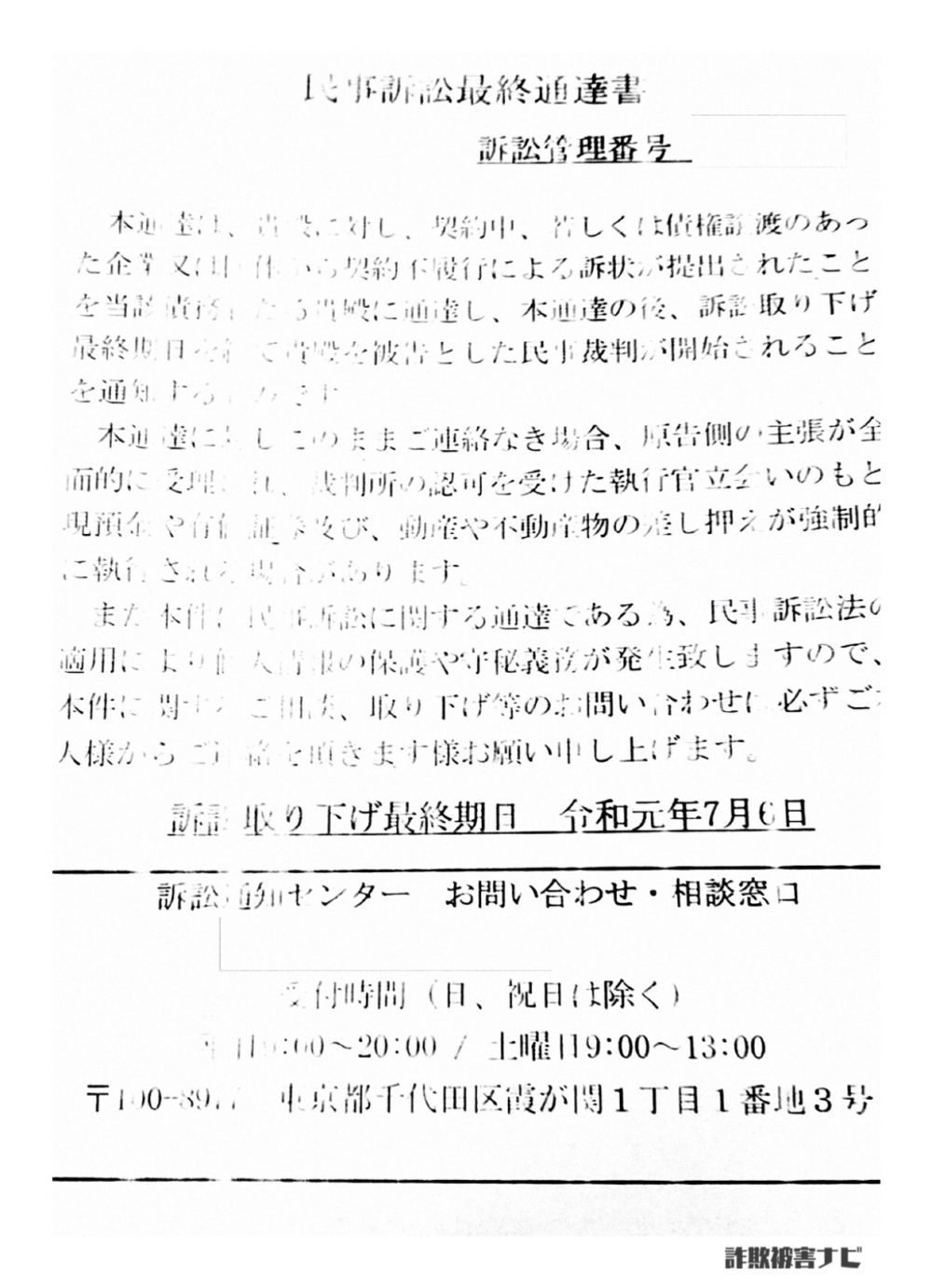 本通達は、貴殿に対し、契約中、若しくは債権譲渡のあった企業又は団体から契約不履行による訴状が提出されたことを当該債務者たる貴殿に通達し、本通達の後、訴訟取り下げ最終期日を経て貴殿を被告とした民事裁判が開始されることを通知するものです。