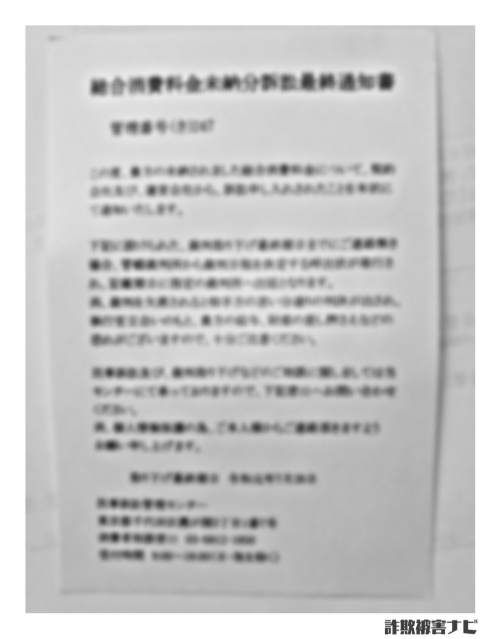 | 葉書の内容 | 総合消費料金未納分訴訟最終通知書 |