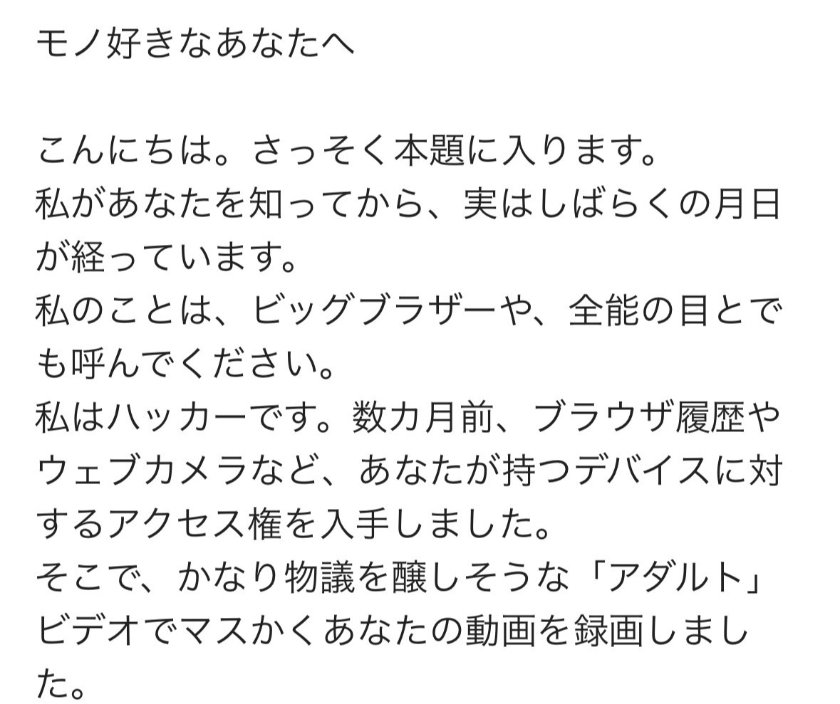 件名:応答なし。 モノ好きなあなたへ こんにちは。さっそく本題に入ります。 私があなたを知ってから、実はしばらくの月日が経っています。 私のことは、ビッグブラザーや、全能の目とでも呼んでください。 私はハッカーです。数カ月前、ブラウザ履歴やウェブカメラなど、あなたが持つデバイスに対するアクセス権を入手しました。 そこで、かなり物議を醸しそうな「アダルト」ビデオでマスかくあなたの動画を録画しました。 ご家族や同僚、あなたのメールの連絡先に、気持ち良さに浸っているあなたの動画を見られたくはないでしょう。しかも、あなたのお気に入りの「ジャンル」が、あんなにもエッチなものなら、特に嫌なはず。 この自作動画を私がAVサイトに投稿して一般の目に触れてしまえば、デジタルタトゥーは一生残ることになるでしょう。 どうやってこれらを行ったのか? ネットの安全性をあなたが軽視したため、私はあなたのデバイスのハードディスクにトロイの木馬を楽にインストールできました。 そのお陰で、デバイス上のすべてのデータにアクセスでき、しかも遠隔操作までできます。1つのデバイスに感染させたことで、私はお持ちの全てのデバイスにもアクセスできます。 私のスパイウェアはドライバベースなため、数時間毎に署名を書き換えます。だから、ウイルス対策ソフトやファイアウォールは、絶対に異変を検知することはできません。 私と取引をしましょう。今後一生不安抱えて生きる人生と引き換えに、少額を私に支払ってください。 $1700を私のビットコインウォレットに送金してください。: 1DBaXEK8JPEb6H96BbA3TcHx6W8VDdRZRS 送金が確認できたらすぐに、あなたに害を与えるすべての動画を削除し、お持ちの全てのデバイスからウイルスを消去します。それっきり、私からあなたに連絡をすることは一切ありません。 メッセンジャーのメッセージを見た限り、あなたはまともな人間だと思われているようですが、周りの評判を落とさない代償として、これはかなり少額です。私は、既に持っているもので満足できるようにする、ライフコーチだとでも思ってください。 48時間の猶予を与えます。このメールを開封した瞬間、私には通知が送られ、カウントダウンは開封時から始まります。 今まで仮想通貨を使ったことがなくても簡単です。検索エンジンで「仮想通貨取引」と書けば、全て調べられます。 下記は、してはいけないことです。 このメールに返信しないでください。一時的なアカウントから送信しています。 警察を呼ばないでください。あなたが所有する全てのデバイスへのアクセス権があるので、警察を呼ぼうとしたことが分かるとすぐに、自動的に全ての動画を公開します。 システムをインストールし直したり、デバイスのリセットをしたりしないでください。まず、既に私は例の動画を持っています。次に、さっきもお伝えした通り、全デバイスを遠隔操作できるので、何か不自然なことを少しでもすれば、どうなるかはお分かりでしょう。 仮想通貨のアドレスは匿名性です。だから、私のウォレットを追跡することもできません。 とにかく、お互いが得するように、この状況を解決しましょう。相手が罠を仕掛けようとしない限り、いつでも私は約束を守ります。 最後に、今後のために助言させてください。もっとオンライン上の安全性に気を付けた方が良いですよ。どのアカウントでも、パスワードを頻繁に変更したり、多要素認証を設定したりしてください。 よろしくお願いします。